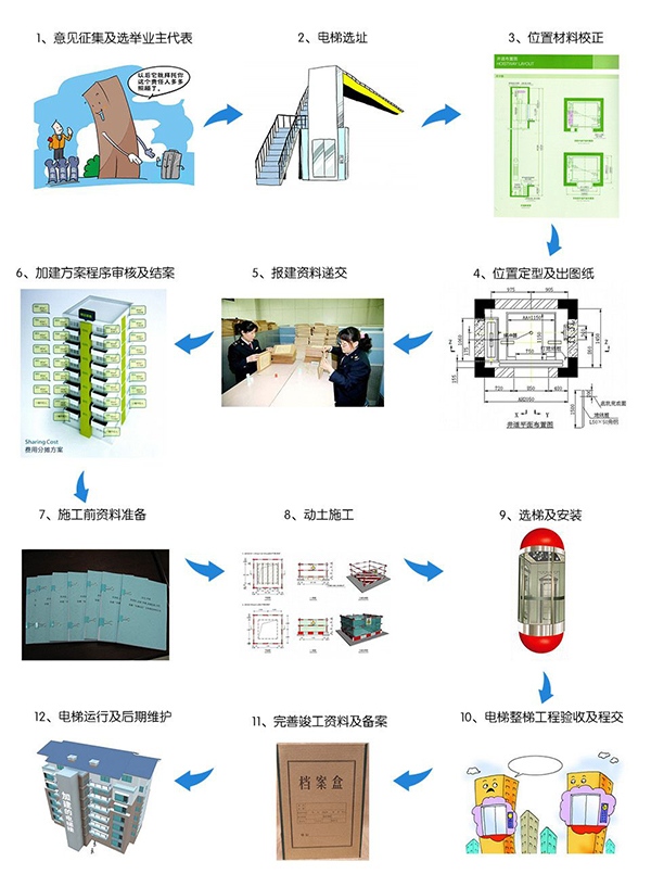 我們提供從電梯加裝位置的選址、報建,到設(shè)計院設(shè)計圖紙、土建施工,再到電梯安裝、電梯驗收、電梯維護(hù)的一條龍服務(wù)。 24小時服務(wù)熱線:400-772-2768 。